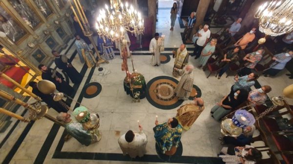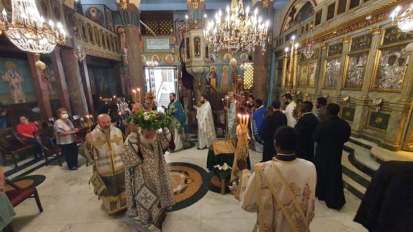 Ο Μακαριώτατος, κατά το Αλεξανδρινό έθος, τέλεσε την περιφορά και την Ύψωση του Τιμίου Σταυρού στον σολέα του Καθολικού της Ιεράς Μονής απ’ όπου, ένδακρυς, εδεήθη υπέρ της λύτρωσης της ανθρωπότητος από την πανδημία του κορωνοϊού.