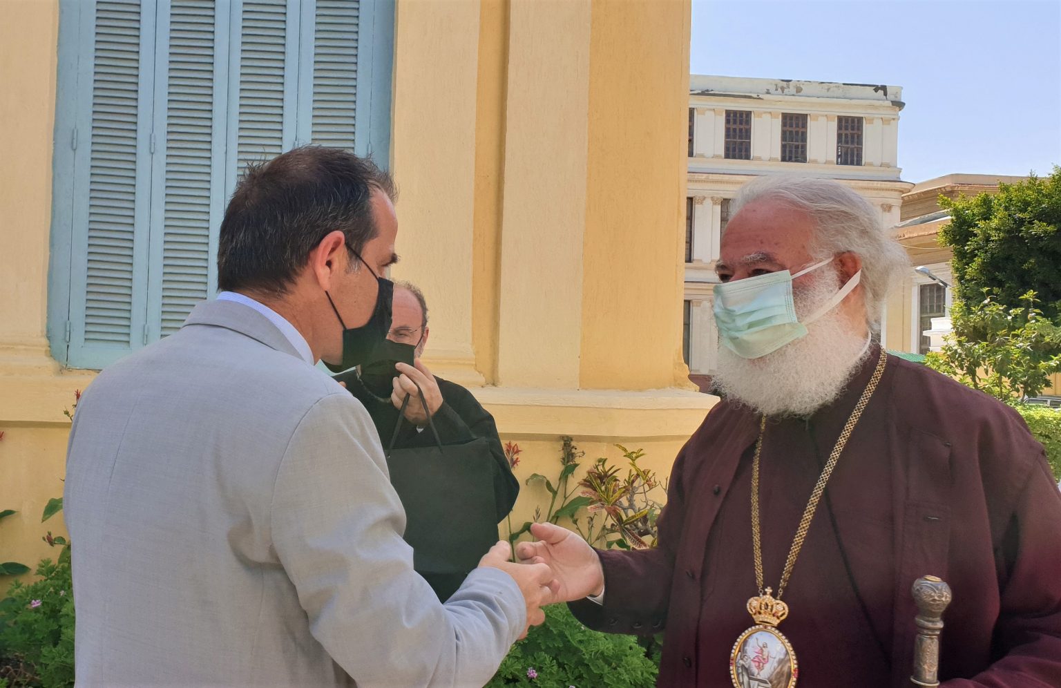 Τον Αλεξανδρινό Προκαθήμενο κ.κ. Θεόδωρο Β΄ που κατέφθασε στο χώρο του Ελληνικού Τετραγώνου του Σάτμπι με τον Πατριαρχικό Επίτροπο Αλεξανδρείας Μητροπολίτη Ναυκράτιδος κ. Νάρκισσο, υποδέχτηκαν ο Α΄ Αντιπρόεδρος της Ελληνικής Κοινότητας Αλεξανδρείας κ. Ανδρέας Βαφειάδης, ο Γενικός Γραμματέας της ΕΚΑ κ. Δημήτρης Κάβουρας και ο Κοινοτικός Επίτροπος και πρώην Αντιπρόεδρος κ. Νικόλας Κόπελος.
