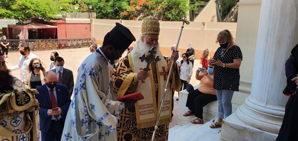 Τον Πατριάρχη πλαισίωσε ο Μητροπολίτης Μέμφιδος Νικόδημος. Στη Θεία Λειτουργία παραβρέθηκε ο Πρέσβης της Ελλάδας στο Κάιρο Νικόλαος Γαριλίδης, ο Πρέσβης της Κύπρου Όμηρος Μαυρομάτης, ο Πρόξενος της Ελλάδος Αχιλλέας Μπικής, ο Πρόεδρος της Ελληνικής Κοινότητας Καΐρου Χρήστος Καβαλής, ο Αντιπρόεδρος Μιχάλης Γκρουνστέιν, η Γενική Γραμματέας Χρυσάνθη Σκουφαρίδου, ο Κοινοτικός Επίτροπος Ανδρέας Ρούσσος, η Πρόεδρος της Ελληνικής Κοινότητας Πορτ Σαϊντ Σούλα Θεοχάρους και ο Πρόεδρος των Aραβοφώνων Κλοντ Νάκας.