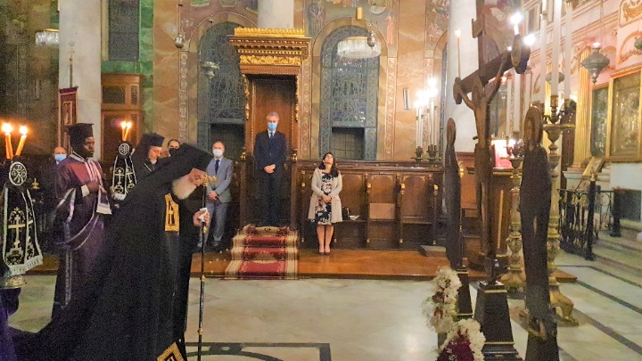 «Ο Ελληνισμός και η Ορθοδοξία θα λάμπουν και θα υπάρχουν». Με τη φράση αυτή, ο Μακαριώτατος Πατριάρχης Αλεξανδρείας και πάσης Αφρικής κ.κ. Θεόδωρος, έδωσε το δικό του μήνυμα, αφού σήκωσε τον Εσταυρωμένο Ιησού και τον λιτάνευσε μέσα σε έναν από τους μεγαλύτερους ναούς της ομογένειας, τον Ευαγγελισμό της Θεοτόκου, στην Αλεξάνδρεια.