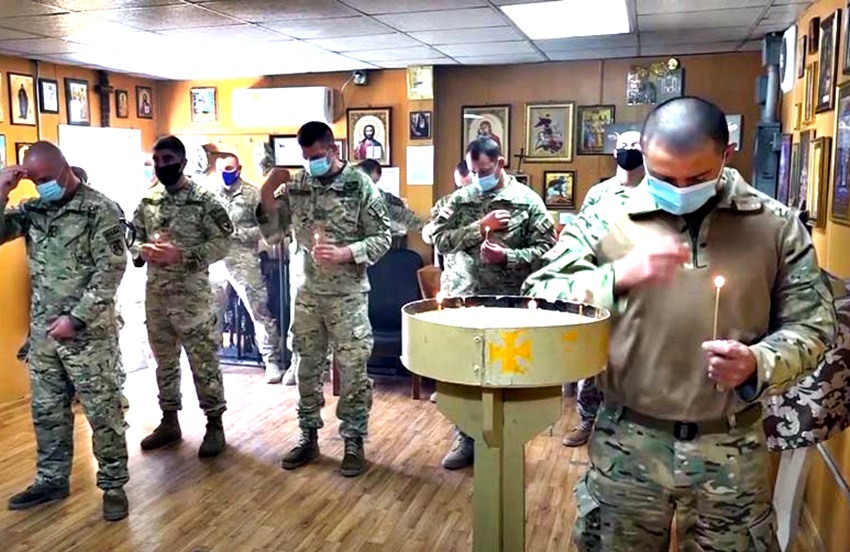 Οι Γεωργιανοί στρατιώτες, που συμμετέχουν στην αποστολή “Ισχυρή υποστήριξη” στο Αφγανιστάν ως ειρηνευτική δύναμη, πανηγύρισαν τη μνήμη του Αγίου Γεωργίου στο ομώνυμο παρεκκλήσι του Αγίου στην αεροπορική βάση Bagram.