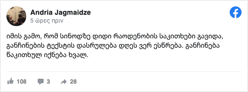 Το ανακοινωθέν των αποφάσεων της Ιεράς Συνόδου του Πατριαρχείου Γεωργίας που συνεδρίασε σήμερα Πέμπτη 11 Φεβρουαρίου 2021, αναμένεται τελικά να δοθεί στην δημοσιότητα αύριο Παρασκευή 12/2, σύμφωνα με τον επικεφαλής του Γραφείου Δημοσίων Σχέσεων του Πατριαρχείου Γεωργίας Πρωτοπρ. Ανδρέα Τζαγμάϊτζε.