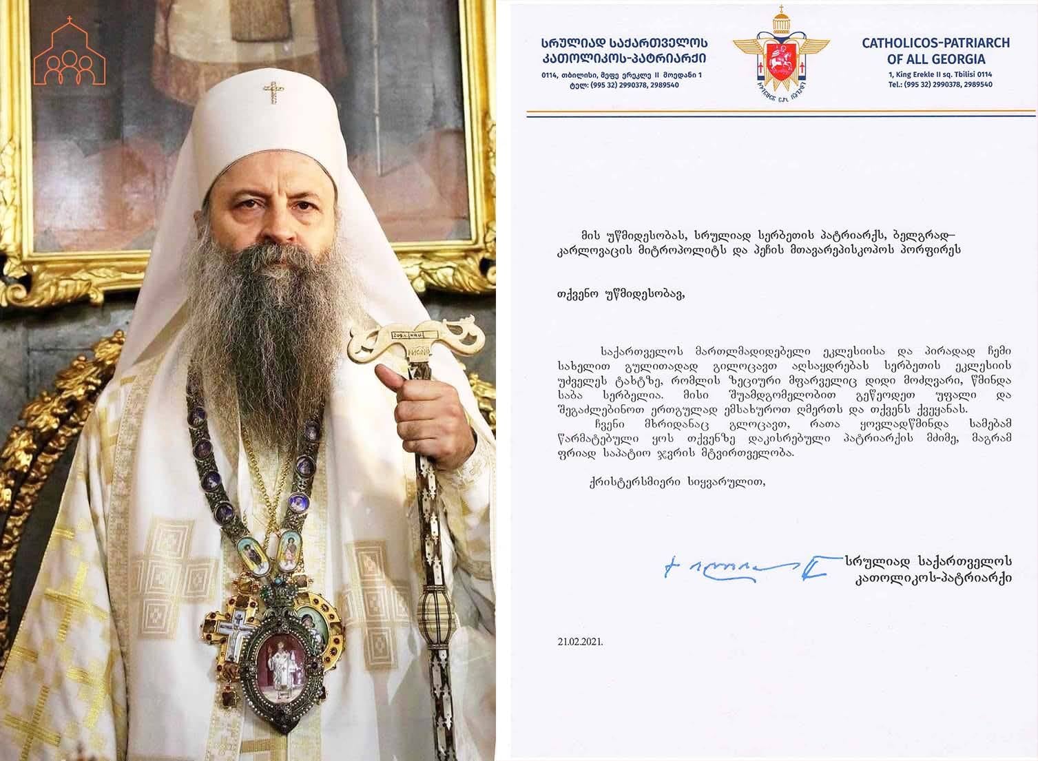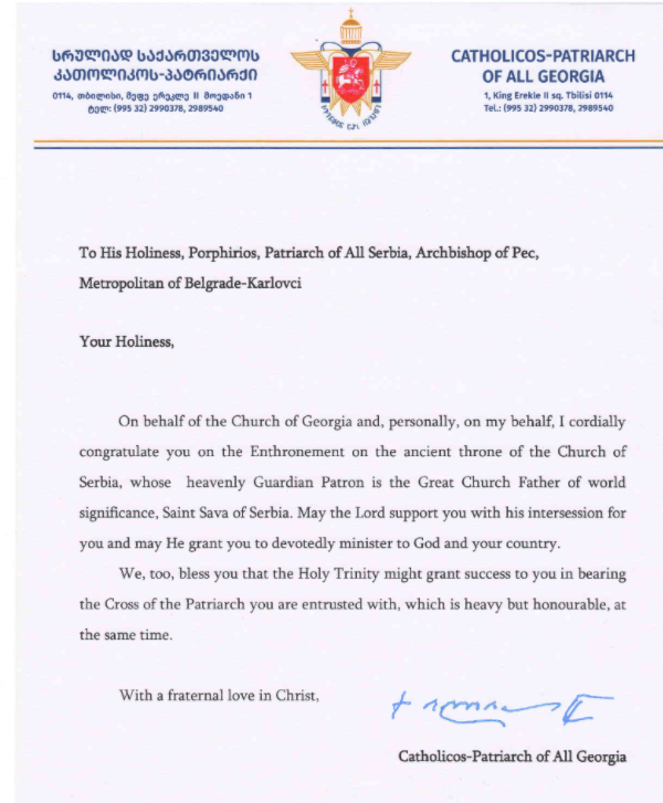 Συγχαρητήρια επιστολή προς τον Μακαριώτατο Πατριάρχη Σερβίας κ.κ. Πορφύριο με την ευκαιρία της ενθρονίσεως του στον Πατριαρχικό θρόνο του Αγίου Σάββα, απέστειλε ο Μακαριώτατος Πατριάρχης Γεωργίας κ.κ. Ηλίας Β’.