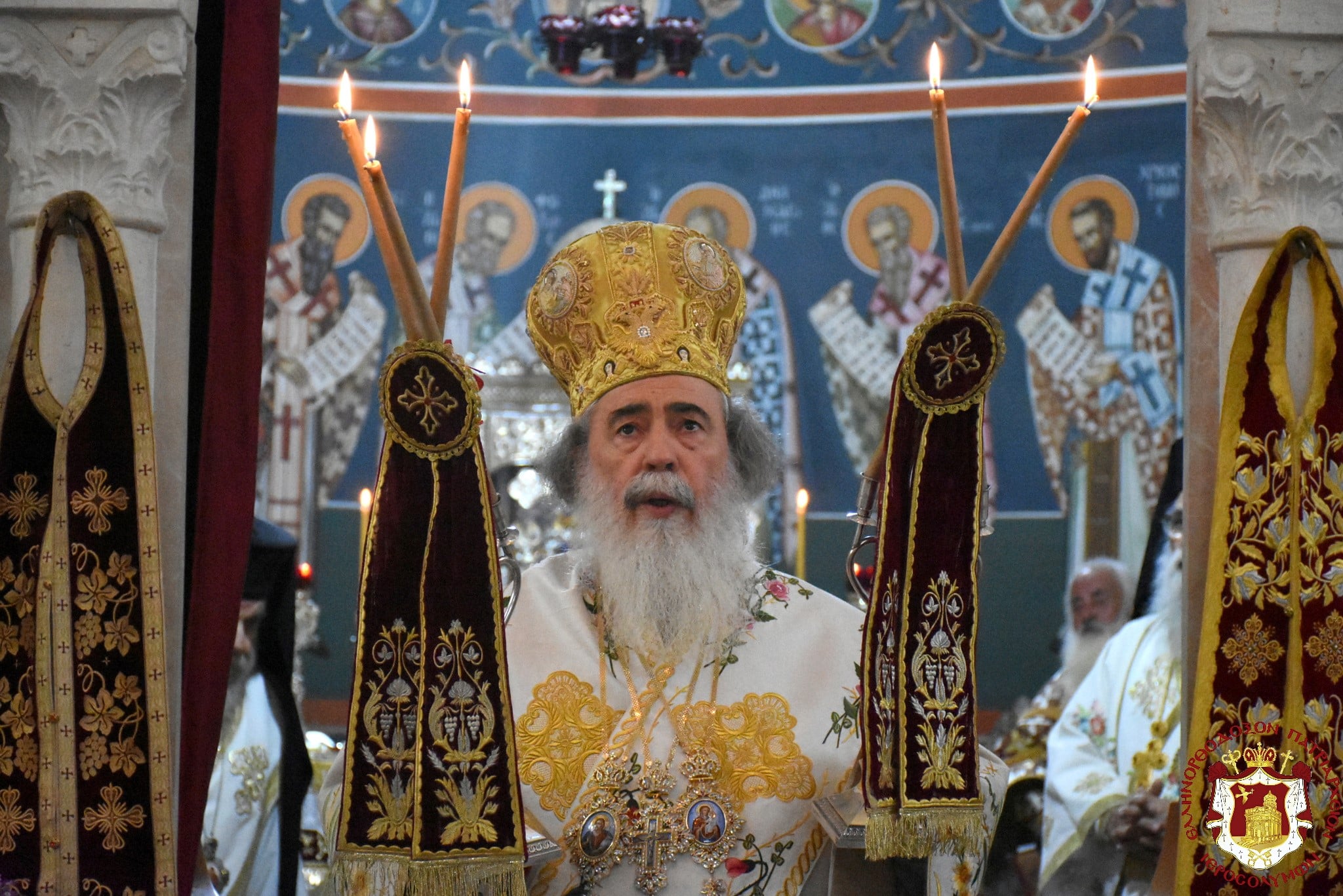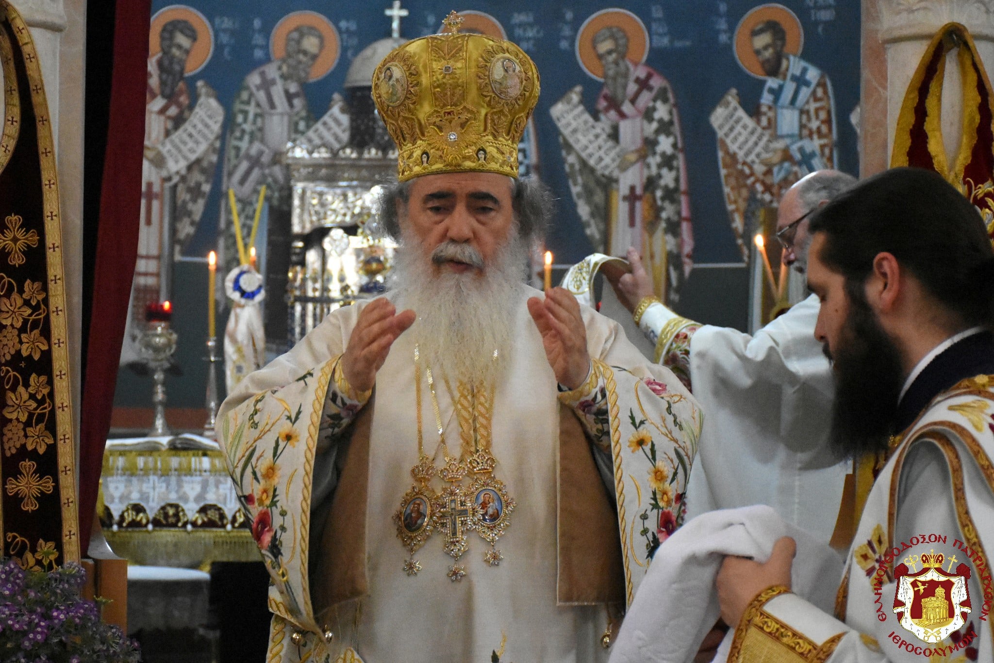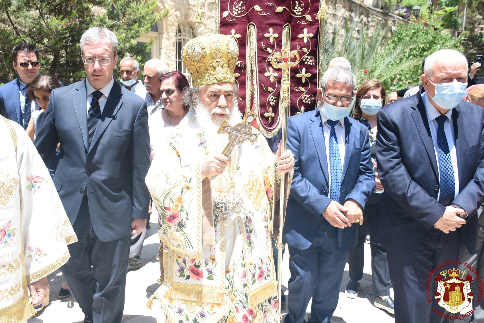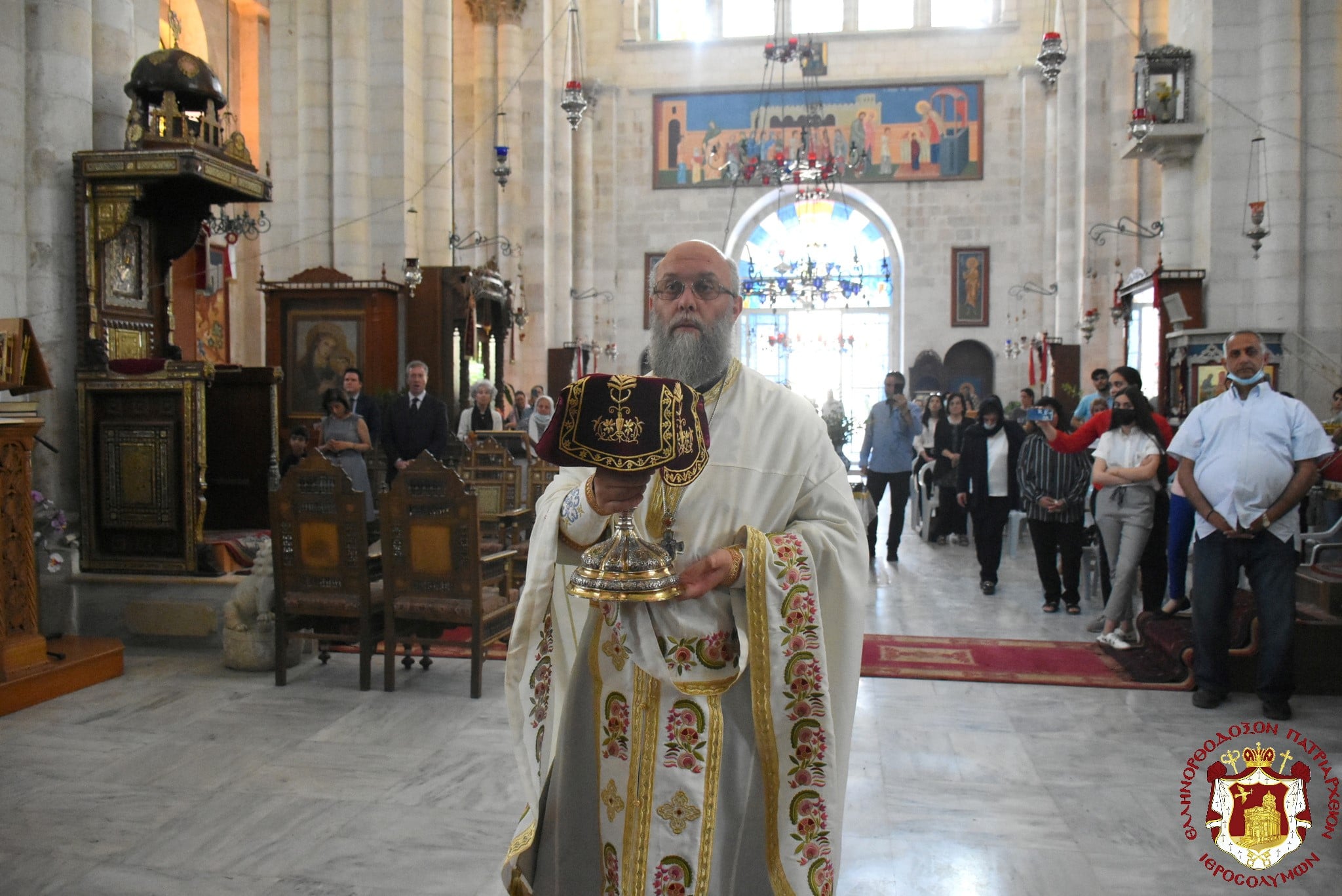 Μετά τοῦ Πατριάρχου συνελειτούργησεν ὁ Σεβασμιώτατος Μητροπολίτης Βόστρων κ. Τιμόθεος, ὁ Σεβασμιώτατος Ἀρχιεπίσκοπος Κωνσταντίνης κ. Ἀρίσταρχος Ἁγιοταφῖται Ἱερομόναχοι καί Ἀραβόφωνοι Πρεσβύτεροι καί διάκονοι ψαλλόντων τοῦ ἰατροῦ Γιακούμπι καί ἄλλων ψαλτῶν τῶν ὁμόρων ἐνοριῶν καί μετεχόντων πολλῶν πιστῶν ἰθαγενῶν καί προσκυνητῶν ἐξ Ἱερουσαλήμ καί τῶν περιοχῶν τῆς Νεαπόλεως, παρουσίᾳ τοῦ Γενικοῦ Προξένου τῆς Ἑλλάδος εἰς τά Ἱεροσόλυμα κ. Εὐαγγέλου Βλιώρα.