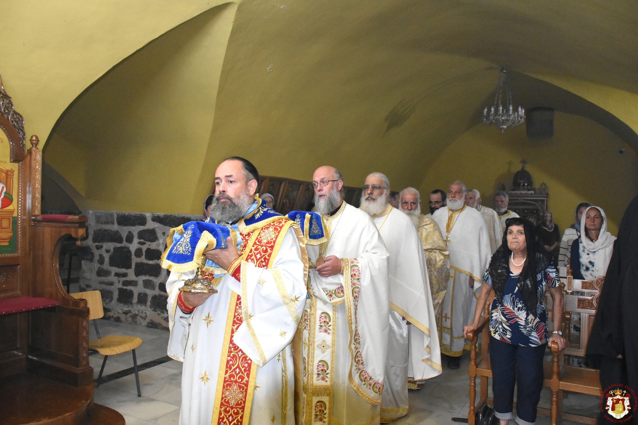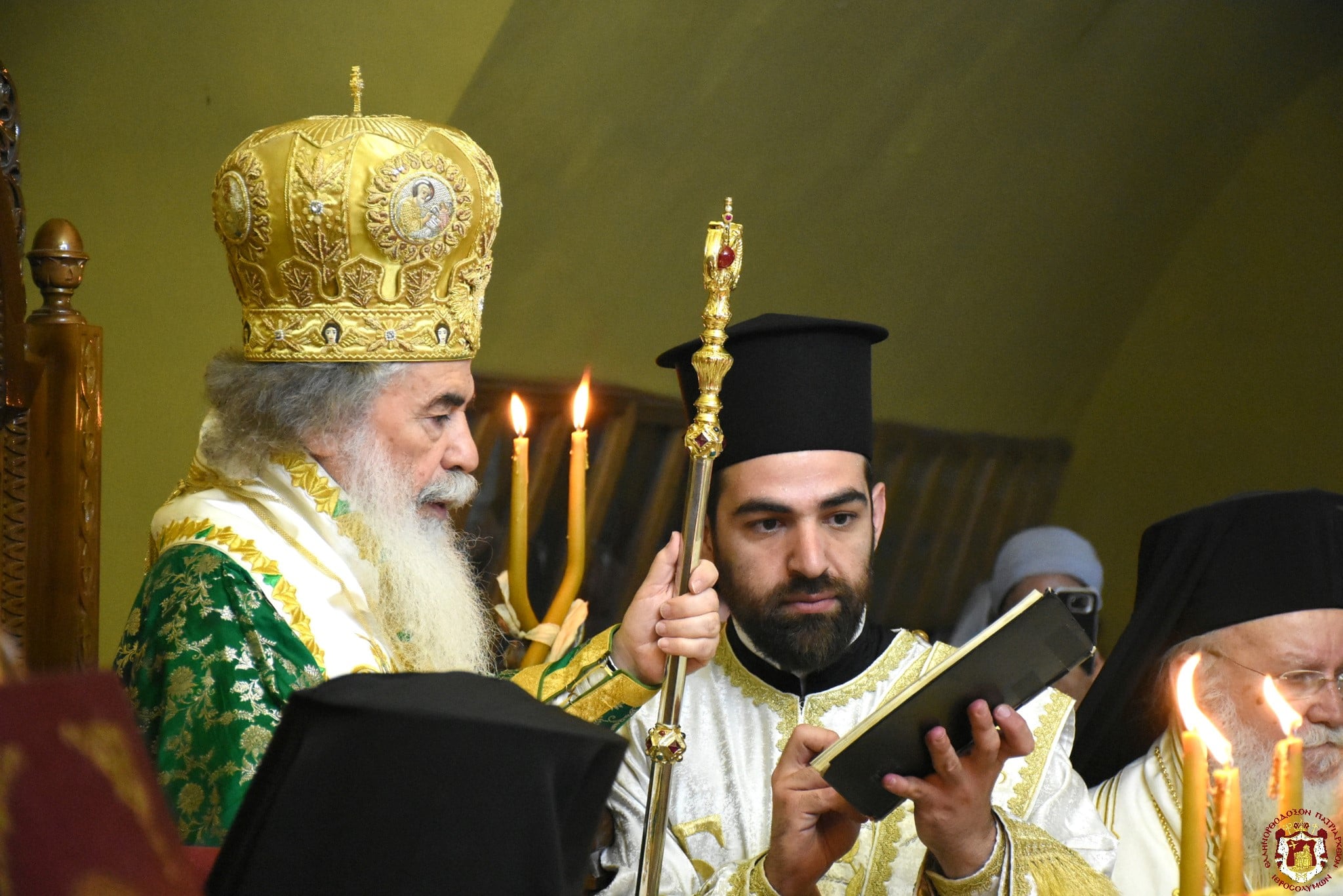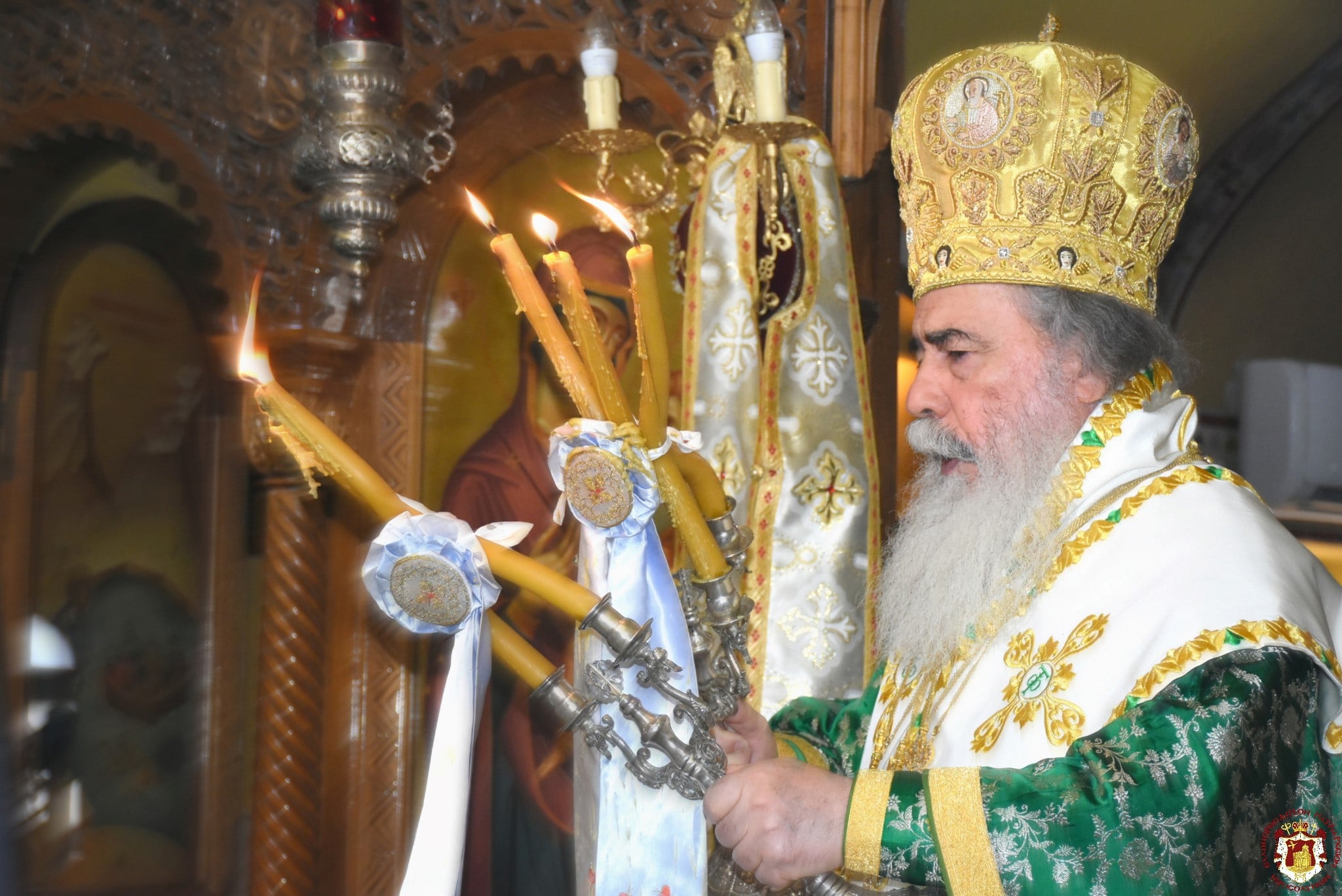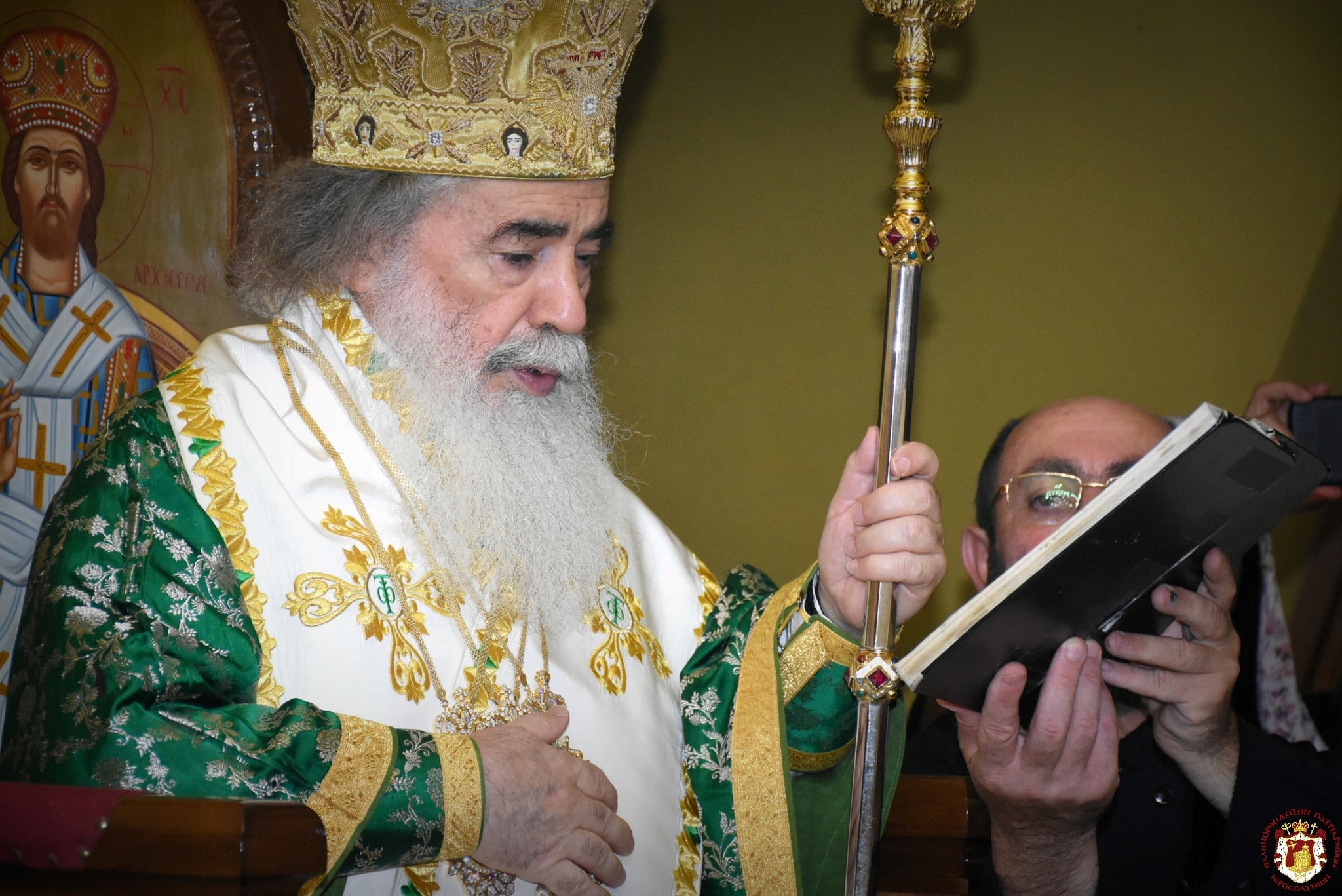 Ἐνταῦθα, ἀνήμερα τῆς ἑορτῆς προεξῆρξε τῆς θείας Λειτουργίας ὁ Μακαριώτατος Πατήρ ἡμῶν καί Πατριάρχης Ἱεροσολύμων κ.κ. Θεόφιλος, συλλειτουργούντων Αὐτῷ τοῦ Σεβασμιωτάτου Μητροπολίτου Ναζαρέτ κ. Κυριακοῦ καί τοῦ Σεβασμιωτάτου Ἀρχιεπισκόπου Κωνσταντίνης κ. Ἀριστάρχου, Ἁγιοταφιτῶν Ἱερομονάχων ὡς τοῦ Γέροντος Καμαράση Ἀρχιμανδρίτου π. Νεκταρίου, καί τῶν Ἀρχιμανδριτῶν π. Χρυσοστόμου καί π. Ἀρτεμίου, Ἀραβοφώνων Πρεσβυτέρων τῆς περιοχῆς Ναζαρέτ, τοῦ Ἀρχιδιακόνου π. Μάρκου καί τοῦ Ἱεροδιακόνου π. Εὐλογίου, ψαλλούσης τῆς χορῳδίας τῆς Ἄκκρης ὑπό τόν Ἀρχιμανδρίτην π. Φιλόθεον καί μετεχόντων Ρωσοφώνων καί Ἀραβοφώνων πιστῶν.