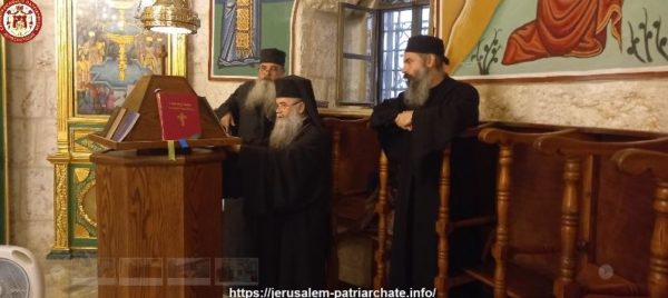 Διαρκούσης της Θείας Λειτουργίας προσήλθε για προσκύνηση η Α.Θ.Μ. Πατριάρχης Ιεροσολύμων κ.κ. Θεόφιλος μετά Πατέρων Αγιοταφιτών.