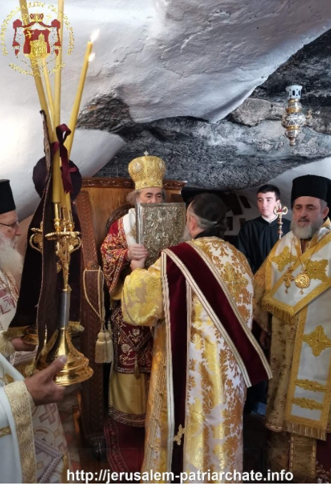 Μετά τοῦ Μακαριωτάτου συνελειτούργησαν οἱ Σεβασμιώτατοι Μητροπολῖται Ναζαρέτ κ. Κυριακός καί Ἑλενουπόλεως κ. Ἰωακείμ, οἱ Ἁγιοταφῖται Ἀρχιμανδρῖται π. Νεκτάριος καί π. Ματθαῖος καί ὁ Ἀρχιδιάκονος π. Μᾶρκος.