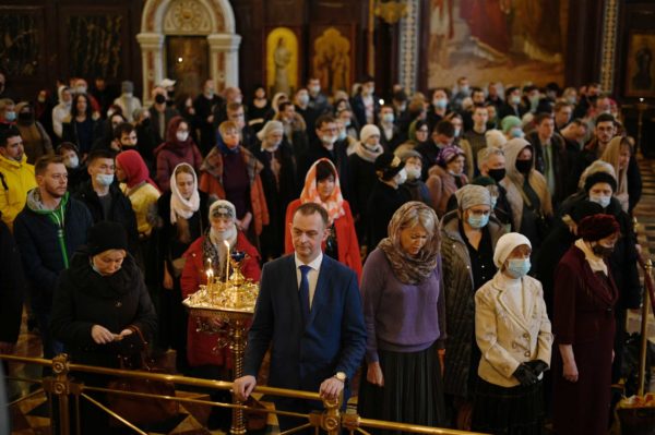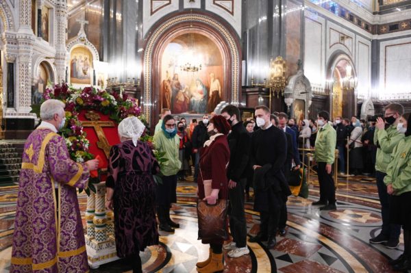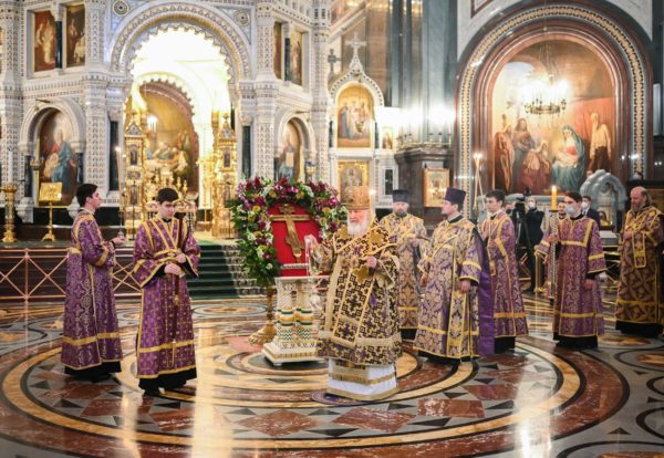 Με ολονυκτία τίμησαν την Κυριακή της Σταυροπροσκυνήσεως στο Καθεδρικό Ναό του Σωτήρος Χριστού στη Μόσχα.