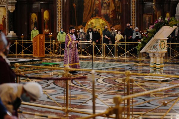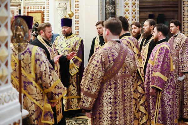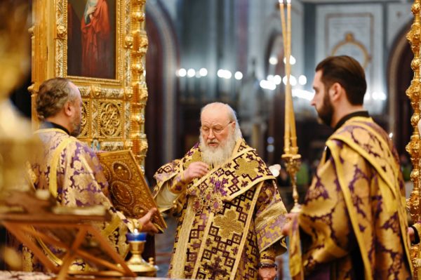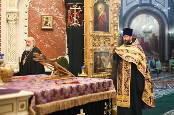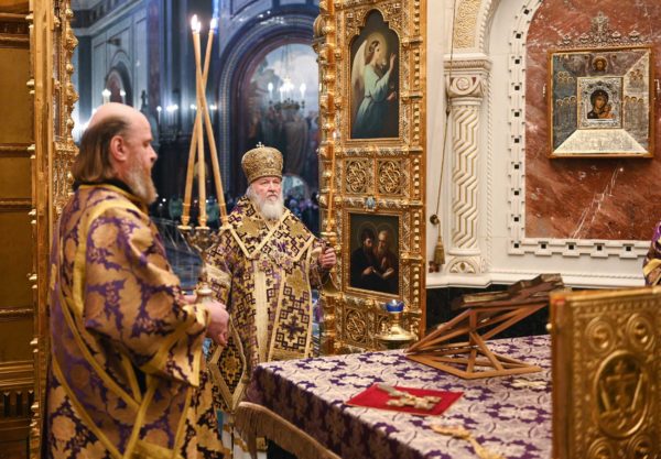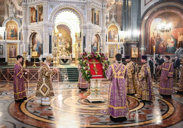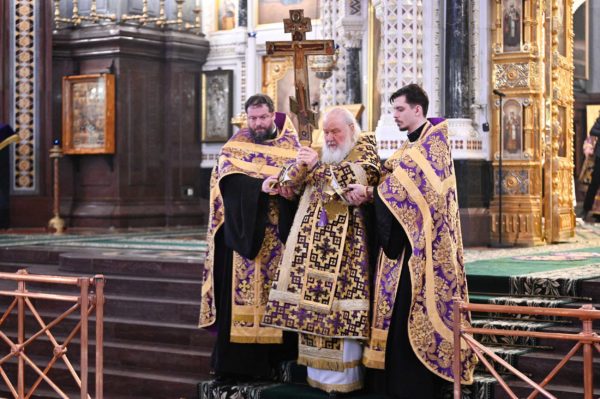 Με ολονυκτία τίμησαν την Κυριακή της Σταυροπροσκυνήσεως στο Καθεδρικό Ναό του Σωτήρος Χριστού στη Μόσχα.