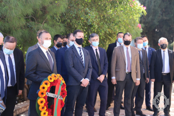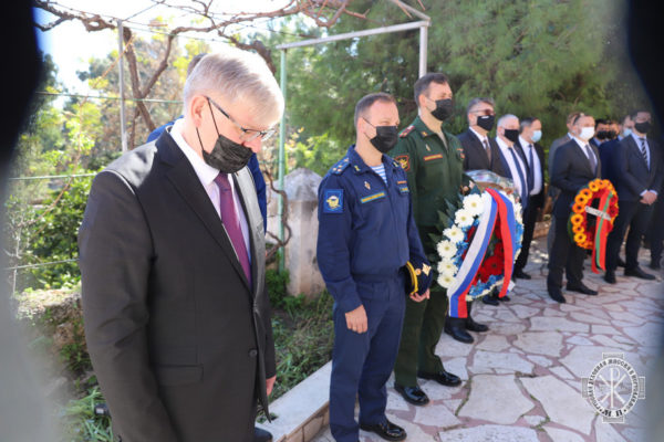 Στη συνέχεια, με τον ήχο του εθνικού ύμνου της Ρωσικής Ομοσπονδίας, οι συμμετέχοντες στην τελετή εναπόθεσαν στεφάνια και λουλούδια στον τάφο.
