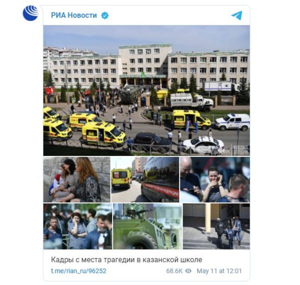 Τα συλλυπητήρια του για την τραγωδία στο σχολείο του Καζάν, όπου ένοπλοι άνοιξαν σήμερα (Τρίτη 11 Μαΐου) πυρ και σκότωσαν 9 ανθρώπους, μεταξύ των οποίων 7 παιδιά, ενώ τραυμάτισαν άλλους 16, εξέφρασε ο Μακαριώτατος Πατριάρχης Μόσχας και πασών των Ρωσιών κ.κ. Κύριλλος, σημειώνοντας δε ότι το περιστατικό εγείρει ζήτημα αναθεώρησης των κανόνων που διέπουν την οπλοκατοχή και οπλοχρησία.