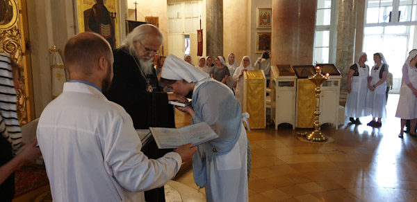 Την ημέρα της αποφοίτησης, πραγματοποιήθηκε Θεία Λειτουργία στην εκκλησία του Τσάρου Δημητρίου στο πρώτο νοσοκομείο της πόλης. Μάλιστα, την Θεία Λειτουργία τέλεσε ο πνευματικός της σχολής, πρόεδρος του Συνοδικού Τμήματος Πρόνοιας και Ευποιίας της Εκκλησίας, επικεφαλής της Επιτροπής νοσοκομειακών υπηρεσιών στο Επισκοπικό Συμβούλιο της Μόσχας, Επίσκοπος Ορέχοβο Ζούγιεβο κ. Παντελεήμων. Στο τέλος της λειτουργίας, ο επίσκοπος απευθύνθηκε στους μελλοντικούς νοσηλευτές, λέγοντας: