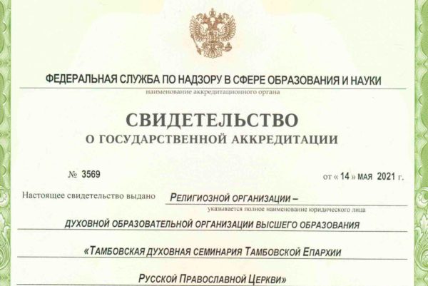 Πιστοποίηση από την Ομοσπονδιακή Υπηρεσία Εποπτείας της Εκπαίδευσης και της Επιστήμης του ρωσικού κράτους έλαβε το Θεολογικό Σεμινάριο του Ταμπόφ, ώστε το πτυχίο του να ισούται με εκείνο των ΑΕΙ, σύμφωνα με διάταγμα από 14 Μαΐου 2021.