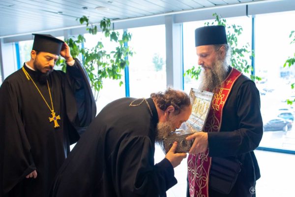 Τον Καθηγούμενο της Σιμωνόπετρας Αρχιμανδρίτη Ελισαίο μαζί με την αδελφότητα όπου συνόδευσαν τα ιερά λείψανα υποδέχτηκε στο Αεροδρόμιο του Βουκουρεστίου “Otopeni” ο Θεοφιλέστατος Επίσκοπος Πραχοβεανούλ κ. Τιμόθεος.