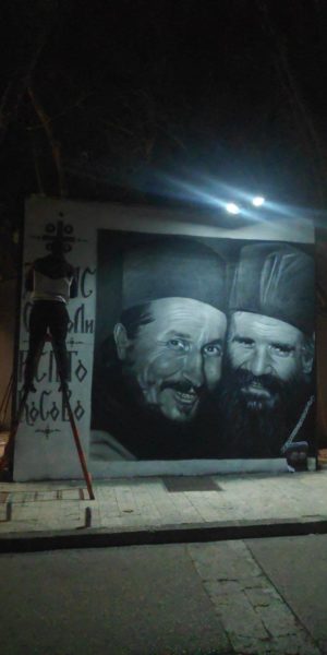 Την έκπληξη, όμως, έκαναν οι νέοι της πόλης Τρέμπινιε, που αποτύπωσαν το βράδυ σε έναν τοίχο τη φωτογραφία του μακαριστού Επισκόπου Αθανάσιου με τον χριστοδίδυμό του, όπως τους χαρακτήριζε ο Άγιος Ιουστίνος Πόποβττς, μακαριστό Μητροπολίτη Μαυροβουνίου και Παραθαλασσίας κυρό Αμφιλόχιο: