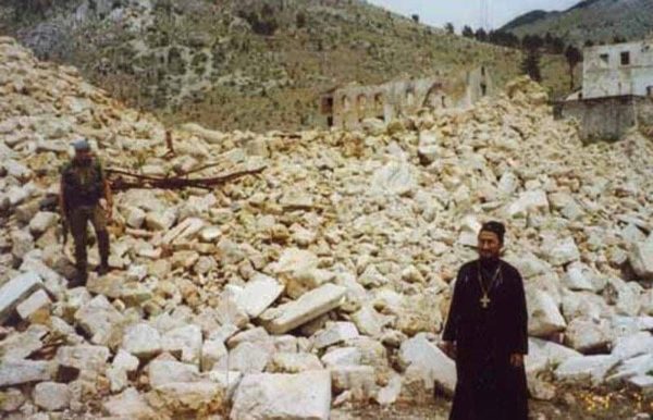 Ο επίσκοπος Αθανάσιος στα ερείπια της εκκλησίας του Καθεδρικού ναού στο Μόσταρ.