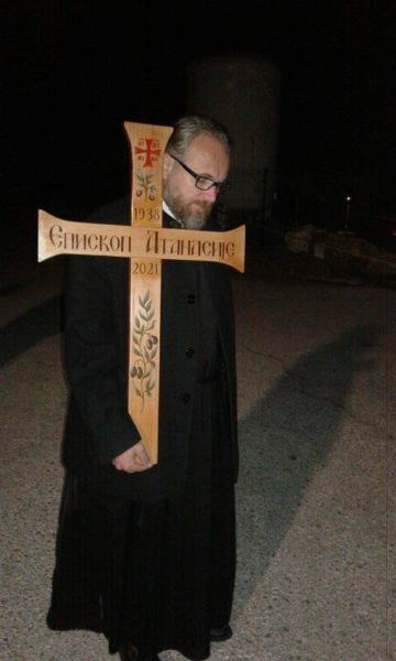 Στο φωτογραφικό στιγμιότυπο, ο προπομπός του σκηνώματος του μακαριστού πλέον Επισκόπου πρώην Ζαχουμίου και Ερζεγοβίνης κυρού Αθανάσιου Γιέφτιτς, βαστάζοντας τον ξύλινο ανάγλυφο Σταυρό με το όνομα του, πηγαίνοντας προς τον ναό.