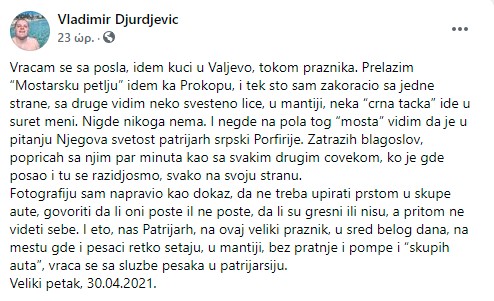 Στο σημείο που λέγεται  “Mostarska petlja” στο Βελιγράδι, δηλαδή, σημείο στο οποίο ο δρόμος χωρίζεται σε πολλές κατευθύνσεις, είναι ένα μέρος που σπάνια συναντάς πεζούς, είδα μπροστά μου έναν άνθρωπο με ράσο. Δεν υπήρχε τριγύρω κανείς άλλος, κοιτώντας προσεκτικά κατάλαβα ότι μπροστά μου ήταν ο Πατριάρχης.