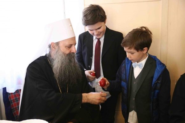 Μετά το πέρας της Λειτουργίας ο Μακαριώτατος συνομίλησε με τα παιδιά που βρέθηκαν στον Ιερό Ναό ενώ τσούγκρισε και τα πασχαλινά αυγά μαζί τους.