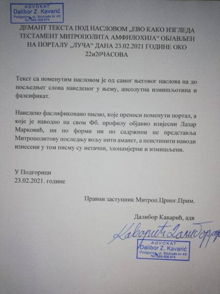 Πλαστή χαρακτηρίζει ο νομικός εκπρόσωπος της Ιεράς Μητρόπολης Μαυροβουνίου κ. Dalibor Kavarić την διαθήκη που έχει κυκλοφορήσει και φέρεται να είναι του μακαριστού Μητροπολίτη Μαυροβουνίου και Παραθαλασσίας κυρού Αμφιλοχίου.