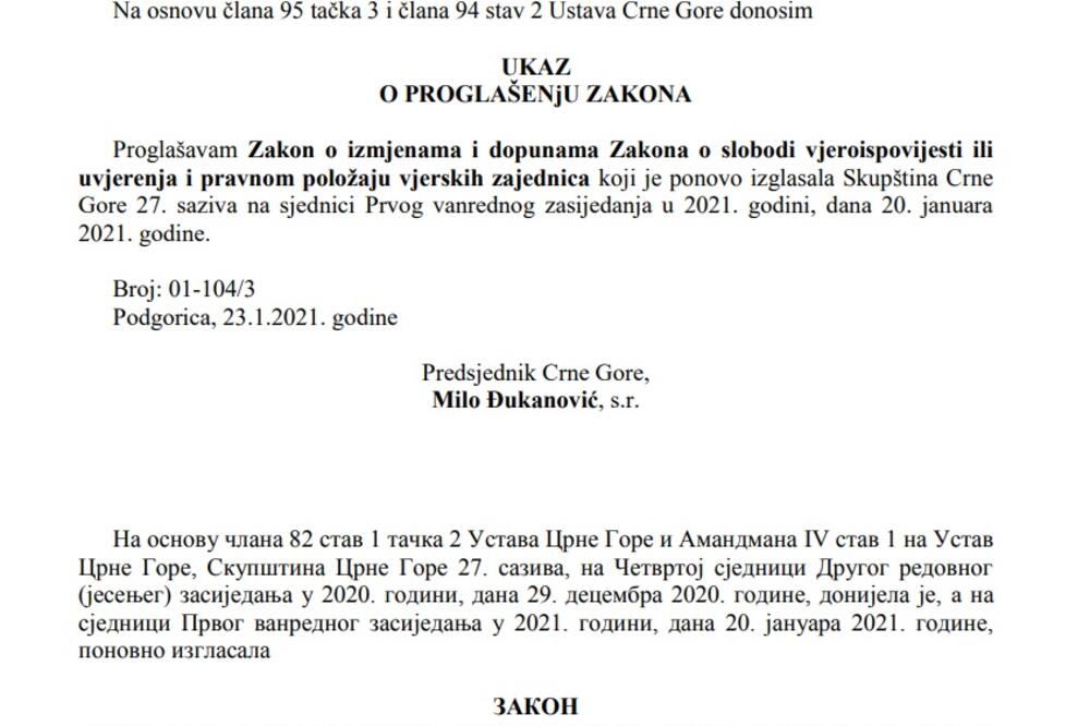 Πρόκειται για ένα σύνολο άρθρων που καθορίζουν την ελευθερία της θρησκείας ή της πίστης αλλά και το νομικό καθεστώς των θρησκευτικών κοινοτήτων, το οποίο παρά την αρχική άρνησή του υπέγραψε τελικά ο πρόεδρος του Μαυροβουνίου Μίλο Τζουκάνοβιτς.