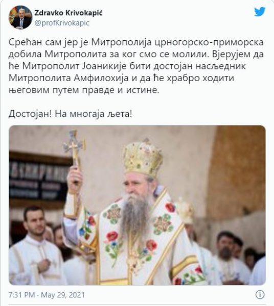 Ο Πρόεδρος του Μαυροβουνίου κ. Ζντράβκο Κριβοκάπιτς ευχήθηκε στον Μητροπολίτη με την εκλογή του “Πιστεύω ότι ο Μητροπολίτης Ιωαννίκιος θα είναι ένας άξιος διάδοχος του Μητροπολίτη Αμφιλοχίου και θα ακολουθήσει γενναία το μονοπάτι της δικαιοσύνης και της αλήθειας”.