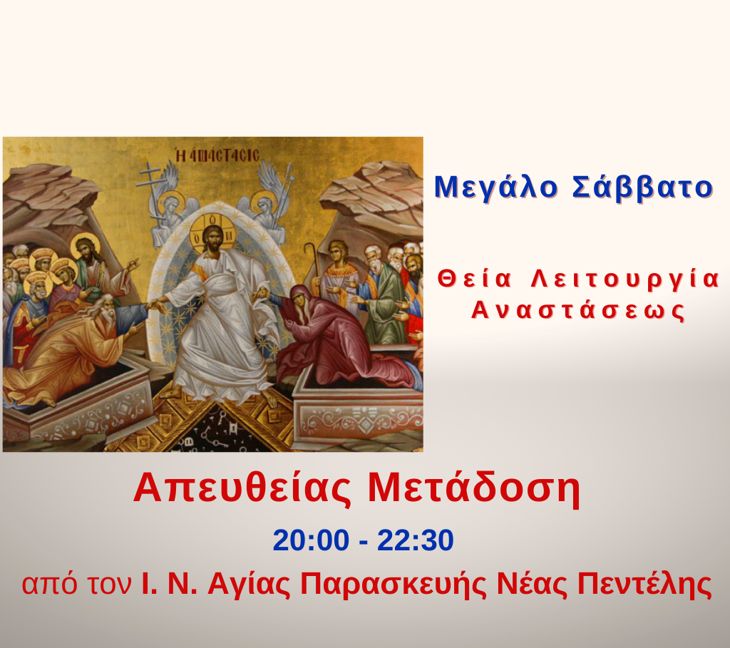 Το ψηφιακό κανάλι Pemptousia TV θα μεταδώσει ζωντανά την Θεία Λειτουργία της Αναστάσεως από τον Ιερό Ναό Αγίας Παρασκευής Νέας Πεντέλης, το Μεγάλο Σάββατο 1 Μαΐου 2021 στις 20:00.
