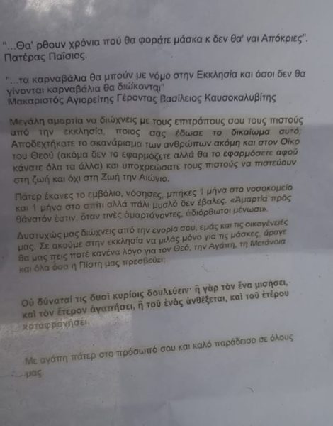 Αναλυτικότερα, οι αρνητές αντέδρασαν στις συμβουλές που έδωσε ο εν λόγω κληρικός από άμβωνος, καλώντας τους πιστούς να τηρούν τα μέτρα κατά του κορωνοϊού και να φορούν μάσκα. Μάλιστα, ο ίδιος είχε νοσήσει (σ.σ. παρότι εμβολιασμένος) από κορωνοϊό και χρειάστηκε να νοσηλευτεί για σχεδόν δύο μήνες, λόγω των σοβαρών επιπλοκών.