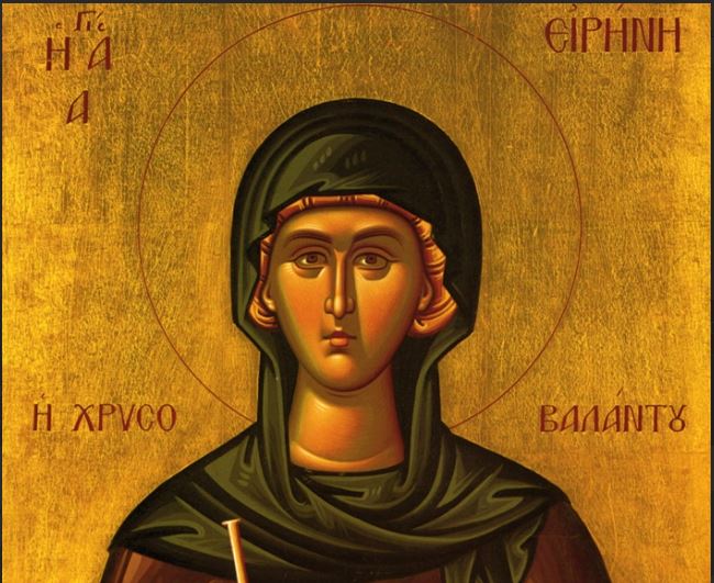Στον δρόμο τους πέρασαν κοντά από το όρος Όλυμπος της Βιθυνίας και η Ειρήνη επισκέφθηκε τον άγιο Ιωαννίκιο τον Μέγα, ο οποίος την χαιρέτησε προλέγοντας ότι θα γινόταν ηγουμένη της Μονής Χρυσοβαλάντου. Η θεία Πρόνοια εμπόδισε τον γάμο της με τον αυτοκράτορα και, με την καρδιά της ξαλαφρωμένη και γεμάτη χαρά, μοίρασε τα υπάρχοντα της και αποσύρθηκε στην Μονή Χρυσοβαλάντου, την όποια είχε ιδρύσει ο πατρίκιος Νικήτας (Νικόλαος), κοντά στην στέρνα του Άσπαρ, σε τόπο ευάερο, μακριά από τις πλατείες και τα θορυβώδη μέρη. Στη μοναχική κουρά της, μαζί με τις τρίχες της κεφαλής έκοψε και κάθε δεσμό που την κρατούσε στον κόσμο και δόθηκε με ζήλο στους ασκητικούς αγώνες γνωρίζοντας ότι στο μέτρο που εξασθενίζει το σώμα, ο εσωτερικός άνθρωπος ανακαινίζεται και πλησιάζει το Θεό. Έχοντας μόνο ένα χιτώνα που άλλαζε μία φορά το χρόνο, τρεφόμενη με νερό και ψωμί, υποτασσόταν πρόθυμα και με χαρά σε ό,τι της όριζαν αγνοώντας τις αντιρρήσεις και τους γογγυσμούς. Η διαρκής κατάνυξη χαροποιούσε τη καρδιά της και έκανε το πρόσωπο της να λάμπει και σαν γόνιμη γη έφερε τους πλούσιους καρπούς των αγίων αρετών. Έβλεπε όλες τις αδελφές της σαν βασίλισσες και θεωρούσε τον εαυτό της ως θεραπαινίδα τους, προσφερόμενη στις πιο ευτελείς εργασίες για να τις διακονεί. Από το στόμα της έβγαιναν μόνο λόγια των Γραφών ή των αγίων Πατέρων, τους οποίους μελετούσε αδιάκοπα. Ενώ ήταν λιγότερο από έναν χρόνο στο μοναστήρι, έχοντας διαβάσει με θαυμασμό τον βίο του αγίου Αρσενίου, ο οποίος προσευχόταν από τη δύση του ηλίου έως την αυγή, προσπάθησε να τον μιμηθεί. Και με τη βοήθεια της θείας χάριτος κατάφερε σιγά-σιγά να στέκει όρθια, με υψωμένα τα χέρια σε προσευχή, όλη την ήμερα και όλη τη νύκτα. Αγωνιζόταν με τέτοια σοφία να δουλαγωγήσει το σώμα στην ανάταση της ψυχής της προς το Θεό, ώστε καμία μέθοδος του δαίμονα δεν μπορούσε να την πλήξει. Όταν εκείνος της υπέβαλλε μνήμες από τη δόξα και την ευμάρεια της ζωής που είχε εγκαταλείψει, πήγαινε να εξομολογηθεί τους λογισμούς της στην ηγουμένη της, διπλασίαζε την άσκησή της και αμέσως ελευθερωνόταν από τις αναμνήσεις αυτές.
